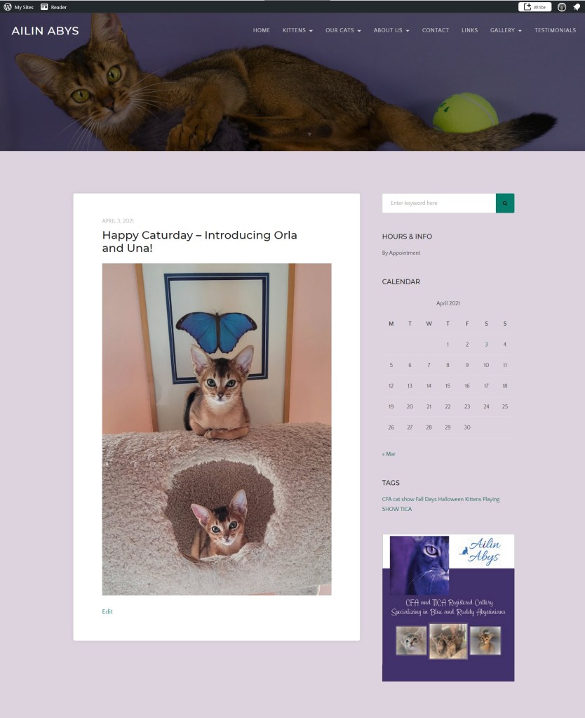 My husband Keith and I breed and exhibit purebred Abyssinians. The theme is our cat Keiko who also graces our FB page as well. The graphics and colors have evolved over time as well as the integration with Instagram and FB. Like my site I use WordPress which has saved me time and when at shows I can post updates to the blog from my phone or tablet.