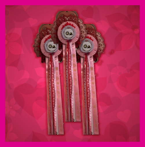 The bandanas I made were for the fun classes for the contest. They are made of cotton fabric the pink side is hearts and the blue side has pink dragonflies with a dark hot pink over-stich so it will wear well. Our model on the left is Keiko who was fine with demoing the bandana for at least 5 mins.