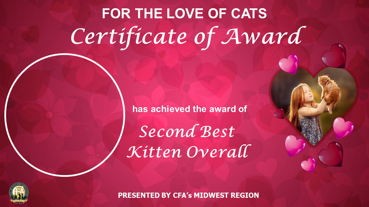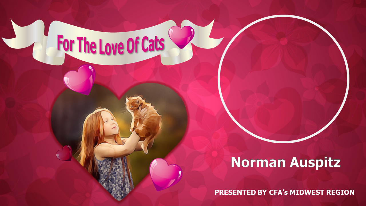 Started design work in late December during vacation for CFA Midwest Regions second annual virtual photo contest – For the Love of Cats! The request from our VCC committee chair was to use a cat being loved by a child and then morph the graphics for the website using pinks and reds with a Valentine theme. I found several free online photos with little girls with their cats. Also, one of the cat conformation classes was Seeing Red. We both liked one photo which was a red-headed little girl that actually looked like my sister Siobhan when she was a child. One of the other ideas I had was to use some valentines for Instagram and Facebook ads by one of the other committee members who does our marketing online.