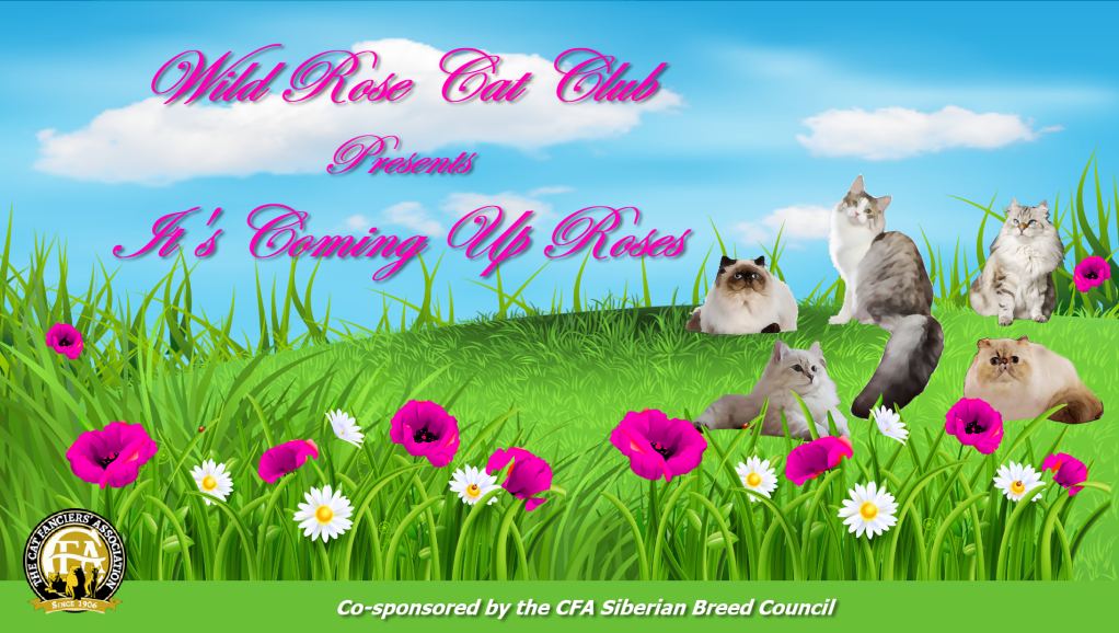 Design work for the Wile Rose Cat Club that is co-sponsored by the CFA Siberian Breed Council. The Wild Rose of Iowa chosen with a few daisies and grass for the background. One of the requests from a fellow committee member to put in a few Himmie Persian cats as well as a few Siberians. Biggest challenge was removing the backgrounds from some of the original photos of cats which reflected the color of the backdrops used by the photographers.