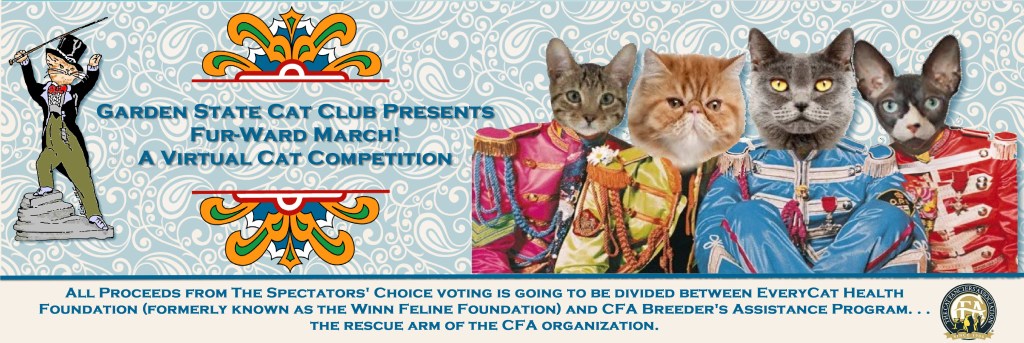 March came in like an aby and went out like a tabby. Garden State Contest theme was Fur-Ward March. They wanted to use their logo. I thought it would be fun to use a Beatles Sargent Peppers Lonely hearts Club Band Theme replacing the Fab4 faces with cats with keeping their marching uniforms! Originally I used short haired cats, but the ask was to add more long hairs, specifically Persians as well as a Sphynx. The club liked theme, but it had to be altered for advertizeing.