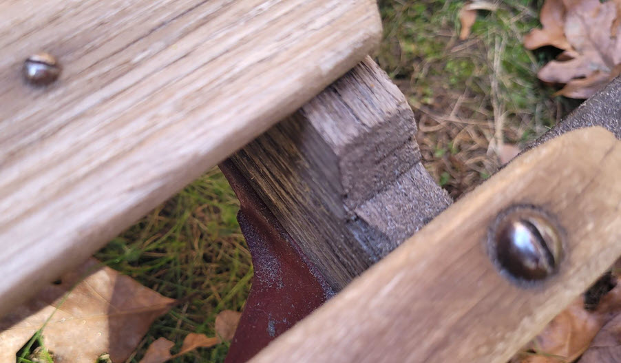I went down to the basement to get an idea for the sled rails and base color for the wood. When I looked at the back to determine its age, I saw that Flexible Flyers have patents and basic markings on the type. I initially thought it was Keith’s from the 1960s, but in the light, I saw a knife carving with his mom’s maiden name, Jean Carol Kresser, and the label “RACER” with a Patent D. It turns out it’s actually from the 1920s, so we guess it was her brother’s originally. Making the age around 100 years old. So cool! Here are a few pictures. It does look as though it gone through many repairs and unlike the other radio flyer it does not have the original hardware or rivets. The hardware pre-dates the 60s.